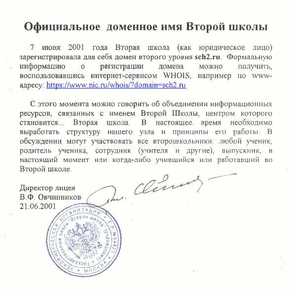 Что считать этим моментом? Для простоты можно начинать летоисчисление официального сайта Второй школы с приобретения домена sch2.ru в июне 2001 года.