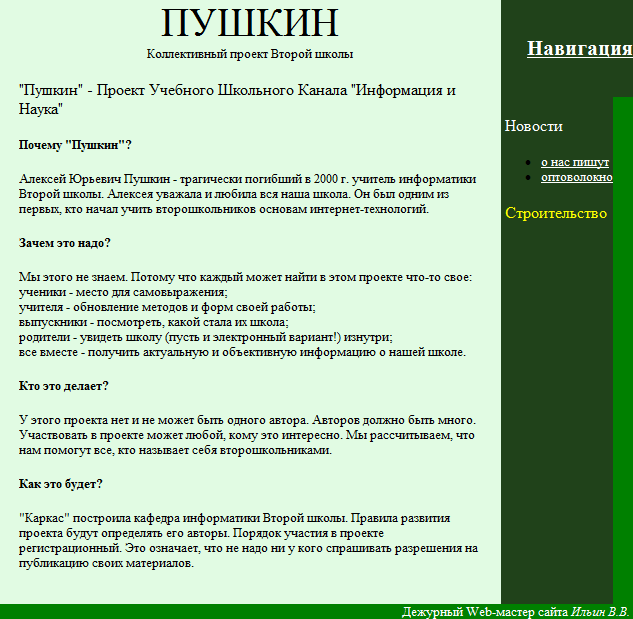 Прекрасно понимая, что и по времени создания и по первоначальному наполнению новый проект проигрывает другим второшкольным интернет-ресурсам, руководители ПУШКИНа решили создать титульную страницу официального сайта и разместить на ней ссылки на ПУШКИН и другие второшкольные сайты.