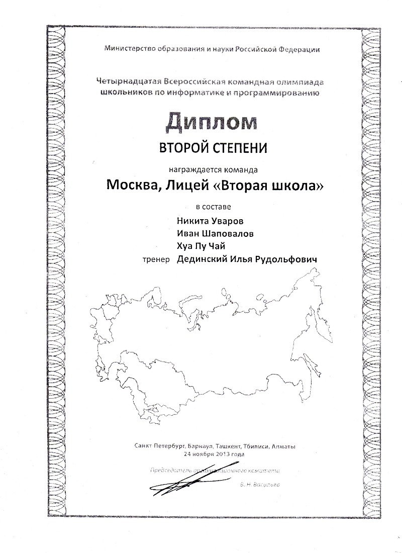 На Всероссийской командной олимпиаде школьников по программированию наши ребята завоевали Второй диплом! Поздравляем команду из 11"В" (Никита Уваров, Иван Шаповалов, Вася Чай) и тренера (И.Р.Дединский)! Гордимся!